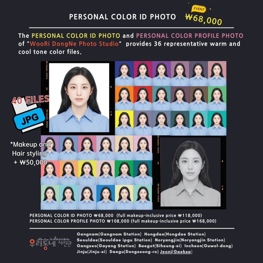 | パーソナルカラー証明写真 | 3 x 4 cm | 68,000ウォン | 6枚プリント+37種背景カラーファイル |
