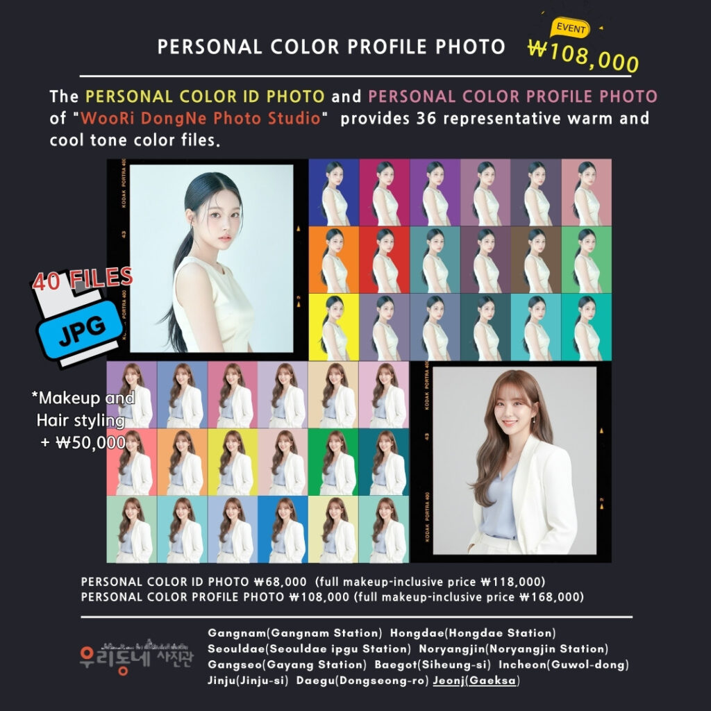 | パーソナルカラー証明写真 | 68,000ウォン | 36種カラー背景ファイル全て含む、フォトカード3種+証明写真プリント、1:1カスタム修正 |
